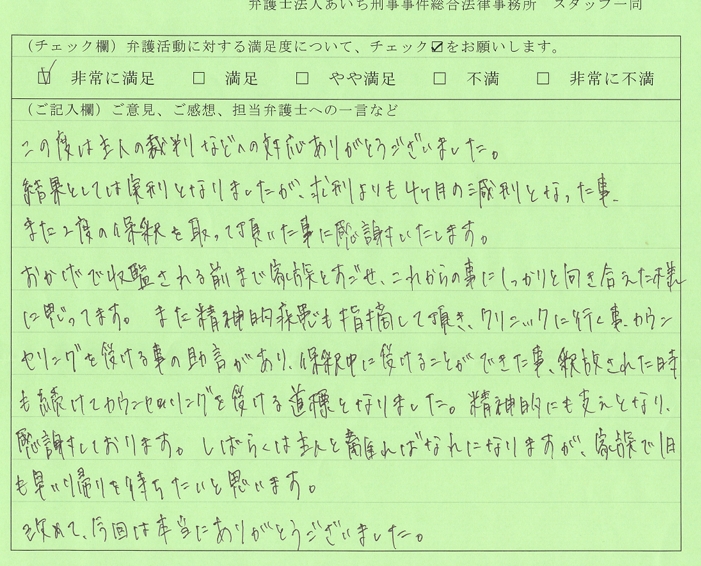 これ以上の減刑を求めて控訴審の対応もさせていただき、結果としてさらなる減刑は叶いませんでしたが、弁護士の献身的なサポートに大変感謝していただけました。